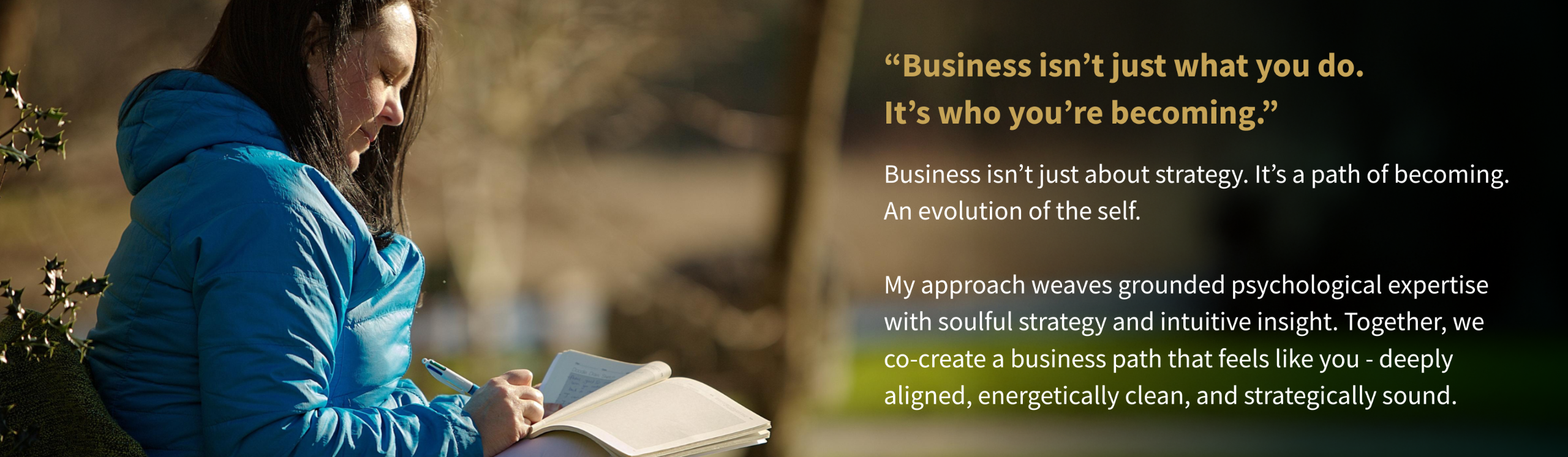 I work in a way that is reflective and strategic in equal measure. I'll ask good questions. I'll challenge you gently when I think you're playing small. I'll celebrate the wins alongside you. And I'll bring real, practical expertise to the table, not just encouragement, but a genuine ability to help you build the thing.